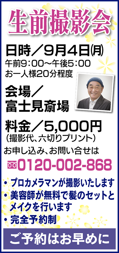 デジタル写真が主流となっている昨今、いざという時に「遺影に使える写真が見つからない」というケースが増えている。多くの人が偲びながら見つめてくれる写真だからこそ、綺麗な姿を残しておいてほしい…。そんな想いをこめて9月4日(月)、富士見斎場が「生前撮影会」を行う。
