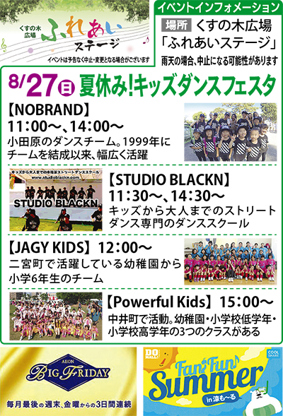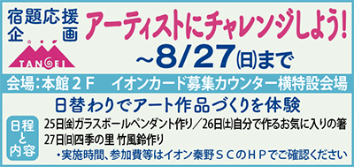 丹沢アートフェスティヴァルとのコラボ「宿題応援ワークショップ」が8月27日(日)まで本館2階で開催。参加費や内容等はHPで確認を。 27日(日)は、くすの木広場ふれあいステージで「夏休み!キッズダンスフェスタ」。子どもたちの躍動感溢れる舞台を応援しよう。 イオンでクールシェア「涼も〜る」は9月3日まで。