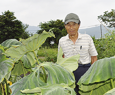 杉原充矩(みつのり)さん(73・秦野市平沢)が育てているサトイモに、花が咲いているのが見つかった。