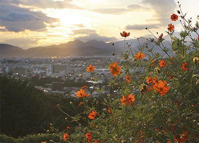 黄色のコスモス畑の向こう側には、夕焼け色に輝く秦野市街地…。
