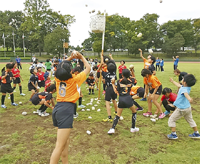 秦野市スポーツ少年団大会が10月1日に市カルチャーパーク陸上競技場で開かれ、サッカー、野球、バレーボール、バスケットボール、乗馬などのチームに所属する子どもたちやその家族など約600人が参加した。市とスポーツ少年団が共催する運動会で42回目。今年は会場にいる未就学児も一緒に楽しめるよう玉入れも行った。