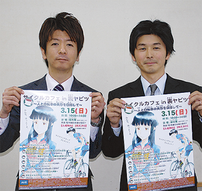 イベントの目玉は、自転車入門漫画『のりりん』の著者・鬼頭氏と遠藤理事長が自転車の魅力やまちづくりを語る対談(午後1時20分〜)。その他、サイクリストを取材し、運転マナーなどをまとめたオリジナルムービーの上映(午前10時〜)、地元野菜を使用した漬物直売や豚汁うどん・飲み物の無料提供、小学6年生までを対象とした「ゆるキャラデザインコンテスト」(受付10時〜)なども予定している。雨天決行、入場無料。時間は午前10時から午後2時まで。