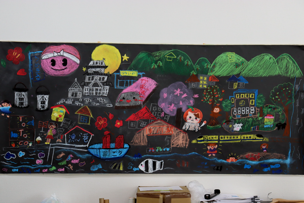 打ち合わせを重ね、実施が決定した取り組みは「黒板壁紙端材を使った『SDGsアート』制作」。壁に貼ると黒板のように描けるデコリアの壁紙の端材に、明日葉が運営する放課後児童クラブの児童たちが絵を描くというものです。