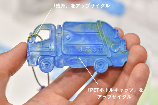これまで、両社のタッグにより実現したワークショップを2回実施しました。ワークショップでは、まず参加者に取り組みの意味について説明。本来は廃棄処分されるような不要なものでも、新しい価値を加えて再生する「アップサイクル」について解説します。その後、湘南貿易が所有する「マニュアルインジェクション装置」を自ら操作してもらい、回収したペットボトルキャップを細かく粉砕したものを材料として、パッカー車などの形に加工。さらに、大貫繊維が所有する「製紐機」を使い、残糸でストラップ部分となる紐を作るのです。この2つを組み合わせてキーホルダーが完成すると、「アップサイクルって、こういうことだったんだね」「これからは、ペットボトルのキャップは捨てない」という感想が聞かれるなど、子ども達が実体験を通じてリサイクルに対する理解を深めた様子が伺えます。このことが、両社にとっての励みになるのだそうです。