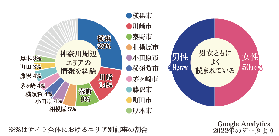 神奈川県と東京多摩周辺の地元イベントやおでかけ情報を掲載しているご近所情報サイトです。2016年の開設以降、1,100万人のユーザーが利用。現在、月間平均閲覧数は50万PVほど。紙面とは異なるアプローチで、自治体や企業のデジタルプロモーションに一役を買っているメディアでもあります。