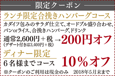 同店で長らく愛されてきた牛100%のハンバーグに加え、今回新たに合挽きハンバーグが誕生。日本テレビ「得する人損する人」で紹介されたレシピを、シェフがさらに進化させた逸品。日頃提供されている、山形県の契約農家から仕入れたA5ランクの黒毛和牛と、厳選した豚肉を贅沢に配合。しっかりした肉の食感にまろやかな旨みが溢れるジューシーな一皿だ。季節のキッシュやローストビーフを盛り合わせた自家製オードブルに、その日の鮮魚を使ったカダイフ包みのサラダ仕立てを取りあわせた自慢のコース。シェフこだわりの味をご堪能あれ。