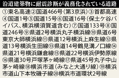 横浜市は7月から、耐震診断を義務付けている市内20本の道路沿い建築物約280棟を対象に、専門家による耐震化サポート事業を開始した。災害時の輸送路確保を目的とするが、対象建築物の所有者は中小企業や個人も多く、資金面といった課題に対し、どこまで改修の道筋をつけられるか、険しい道のりだ。
