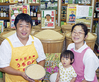 店に一歩はいると、そこには生産者の顔写真付の米樽が並ぶ。創業27年の「酒と米のうちの」では、より安全でおいしい米にこだわり、農家との直接取引、残留農薬ゼロを心がけている。もちろん、放射線量の検査もクリアしている。精米は注文されてから行うので新鮮だ。配達も行っており、お腹に赤ちゃんがいるなど買い物が大変なお母さんにも好評となっている。