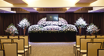 50〜60人程度が着席できる家族葬ホール。1階のロビー、2階の式場、3階の会食室や仮眠室をゆったりと利用できる。花祭壇や音楽の生演奏を用いての式もでき、親身なスタッフとともに、大切な人の旅立ちを温かく演出してくれる。