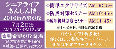 7月2日(土)には希望が丘斎場で、「シニアライフあんしん博2016in希望が丘」を開催する。詳細や問合せは左記へ。