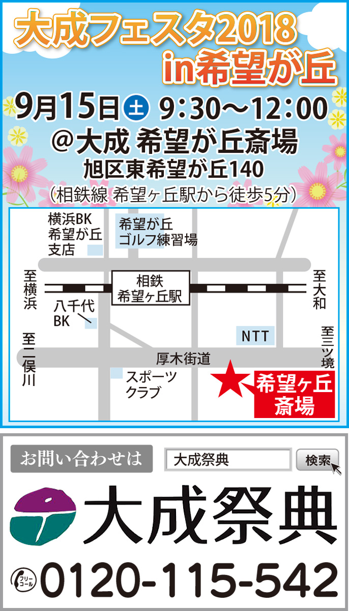 家族葬から一般葬まで、希望に沿った葬送をサポートする大成 希望が丘斎場で9月15日(土)「大成フェスタ2018」が開催される。時間は午前9時30分から正午まで(入場無料・予約不要)。