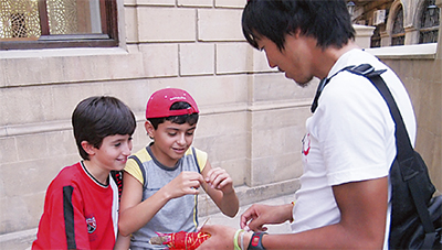 また「日本と世界の子どもたちに繋がりを感じてもらいたい」との想いから、旅の途中で出会う子ども達の手で糸を繋ぐというプロジェクトを考案。これは約20センチの毛糸を1人ずつ結んでもらい、1本の長い糸を完成させるもの。言葉が通じない国でも説明できるよう、シンプルな作業を選んだという。