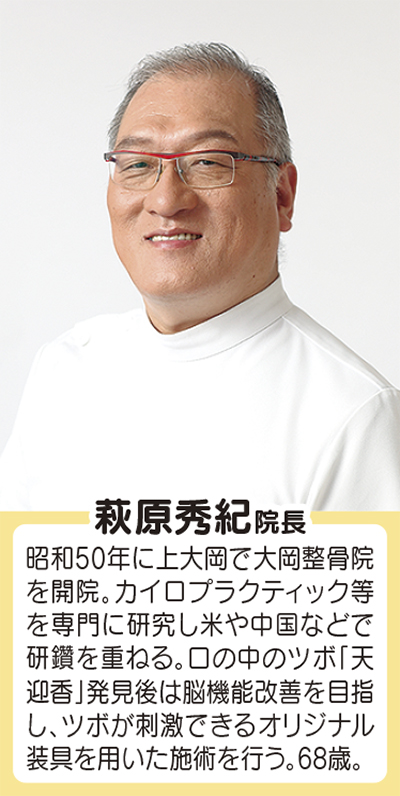 同院で行う施術は口腔内装具のマウスピースを2分間くわえて骨盤を揺らすというもの。施術は約10分で税込1千円(初回無料)。オリジナルのマウスピースが「天迎香(てんげいこう)」という口の中のツボを刺激し、酸素を脳に供給していく。萩原秀紀院長は「脳内の血流量を高めて脳が活性化し、緊張していた筋肉やそれを支えていた組織が緩んでいく効果が期待できます」という。