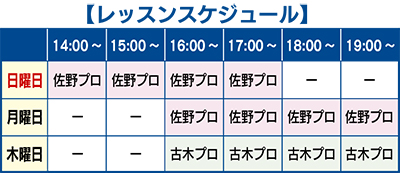 レッスンは50分×4回で、マンツーマンによる個人レッスンは1万8000円、2〜4人のグループレッスンは1万円(共に1人あたり)。スケジュールは上記表を参考に、最新状況を店舗へ問い合わせの上、希望の曜日と時間帯で申し込みを。