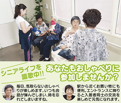 夫が他界しこれから先のことを考え高齢者向けマンションを探し求め、同館に入居したという入居者のひとりは「それまで暮らしていた地域には若い人が多くて、夫が亡くなってから話す機会が減ってしまった。家から出る機会も減ってしまって憂鬱だったが、ここへ来て同じ世代の方々とのお話しや時には一緒にお出かけするのが楽しくてね。ちょっと若返ったみたい」と、新たな暮らしを謳歌している。