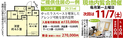 「たちばな館」では笑顔溢れた暮らしぶりを垣間見ることができる「内覧会」を毎月第1土曜日に開催。次回の開催は11月7日で、「建物や居室の見学はもちろん、入居に関する個別の相談なども大歓迎いたします。お気軽にお問い合わせください」と関係者は話している。参加費は無料で事前予約を推奨している。