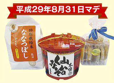 新規に100万円以上の定期預金もしくは定期積金契約に加入するか、年金受給口座を指定した人、または融資の申込み・相談をした人、火災保険の新規契約者に、特別栽培米(ななつぼし)、ヤマカノ仙台味噌、焼き菓子詰め合わせのうちいずれかをプレゼント。