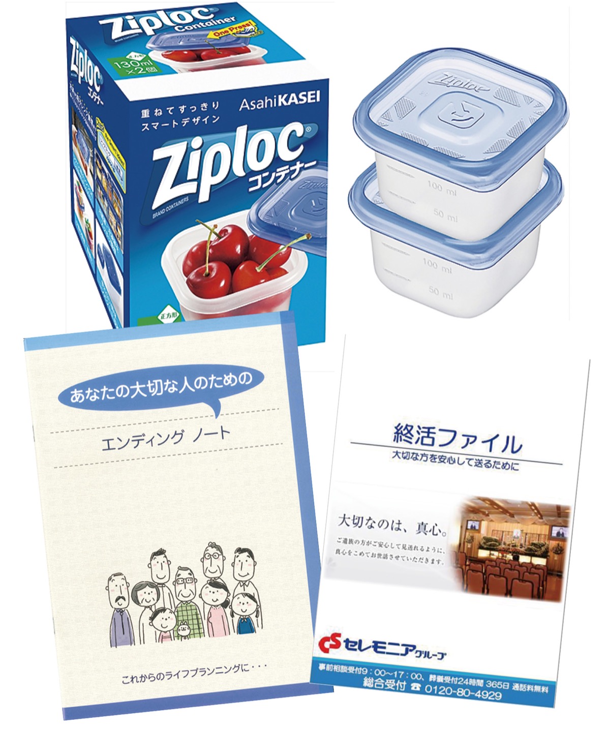 参加者には特典も。よくある質問等を1冊にまとめた『終活ファイル』と、終活に向けてどんな準備をしたら良いかわかる『エンディングノート』、今や生活必需品の『ジップロックコンテナー』をセットにしてプレゼント。