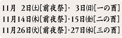 溝口神社恒例の酉の市が、今年は6日間の日程(詳細は上表)で開催される。