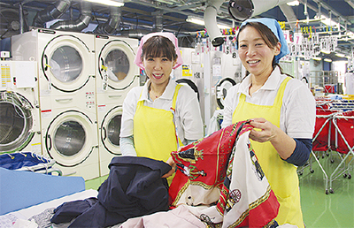 大型工場では色、素材、汚れの度合いによって洗浄するマシンを変え、洗い方などを細かく調整。午前中に届いた衣類は翌日午後には顧客に届けるなど、早く的確に洗い上げてくれる。