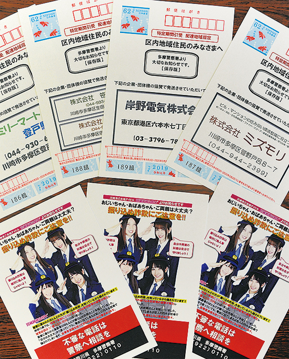 振り込め詐欺防止を呼びかけようと、登戸郵便局(保坂茂男局長)と多摩警察署(加藤和男署長)はくじ付き暑中・残暑見舞いはがき「かもめーる」を啓発用に作成し、多摩区内約2800世帯に配布。多摩署は今月11日、この事業に協賛した8事業者に感謝状を贈った。