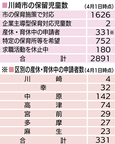 川崎市の前回集計ではこの新定義は適用されておらず、申請をしたものの、保育所を利用していない「保留児童」は2891人だった。そのうち、「産休・育休中の申請者」は331人で、このうち何人が新たに待機児童として集計されるのかがポイントとなる。
