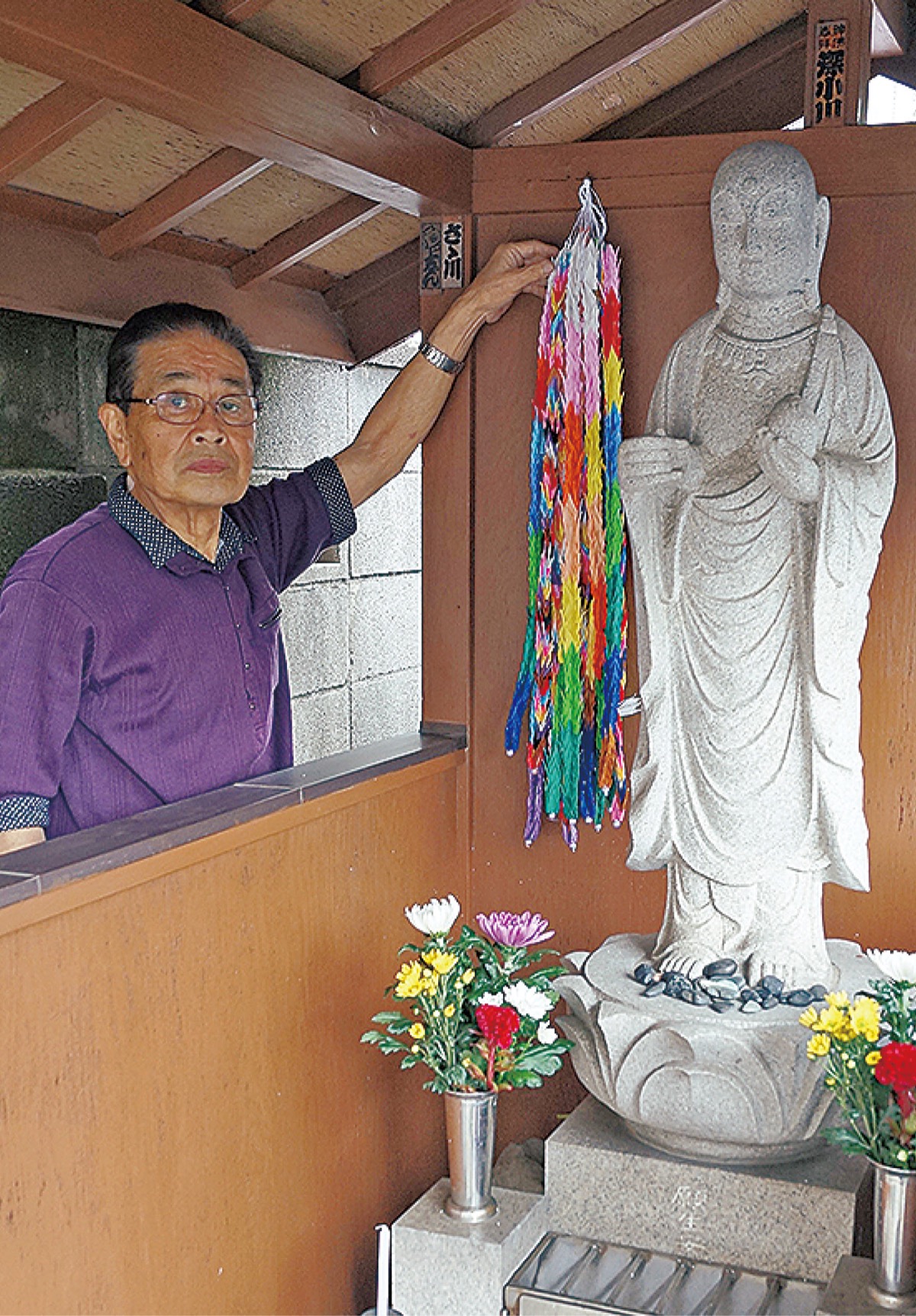 幸区南加瀬にある「地蔵尊」に5月22日、南加瀬原町内会(三橋宏一会長)の有志5人が千羽鶴を手向けた。