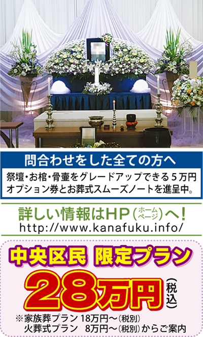神奈川福祉葬祭では中央区民限定プランへの問い合わせが増えている。葬式に必要なものが全て含まれて税込28万円。家族や親戚を中心に近親者で行う通夜、告別式に利用できる。