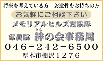 人生の最期を見つめ、様々な準備を行う「終活」が、ここ数年で広まっている。厚木市棚沢の雲渓山常昌院ではこの度、人生の最終章をイキイキと暮らすための、各自の永代供養墓と交流の場として「常昌院 絆(とも)の会」を創設。第一期の会員を募集する。