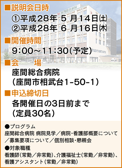 今春4月に開院した「座間総合病院」が新規病棟オープンに向けて、看護・介護職を募集し、就職説明会を開催する。
