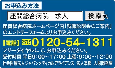 採用担当者は「新しい病院で、これまでのご経験を活かしながら、一緒に楽しく働きませんか」と話している。問合せは左記へ。