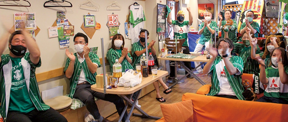 この日南区大野台の飲食店「TABERNA MASSA」ではチームカラーのグリーンのシャツやユニフォームを着たダイナメイツがテレビ観戦。昇格の行方を見守った。