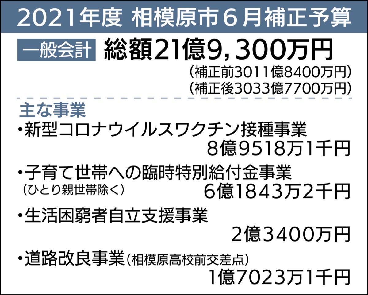 相模原市は新型コロナウイルスに対するワクチン接種事業や予防対策事業、生活困窮者への支援などに要する経費として、総額21億9300万円の2021年度6月補正予算案を市議会に提出し、先月25日まで開かれた6月定例会議で可決された。