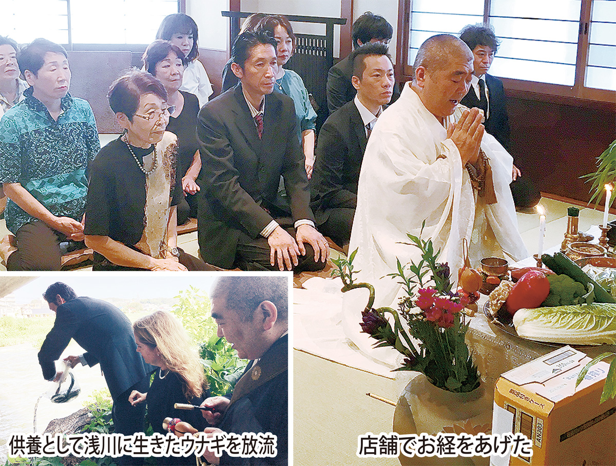 今年も例年通り、店舗内でお経をあげ、供養として近くの浅川土手に生きたウナギを放流した。