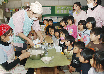 大和市立草柳保育園(相原叔子園長)で14日、災害時を想定した炊き出し訓練が開催され、全園児約110人が参加した。
