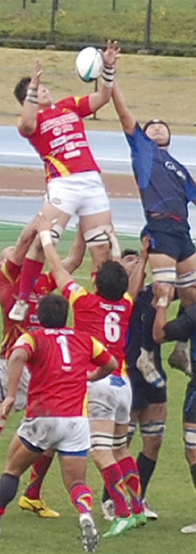 東日本大震災で被災した岩手県釜石市の社会人ラグビーチーム「釜石シーウェイブス」がこのほど、海老名運動公園で厚木市内を拠点に活動する栗田工業と対戦した=写真。