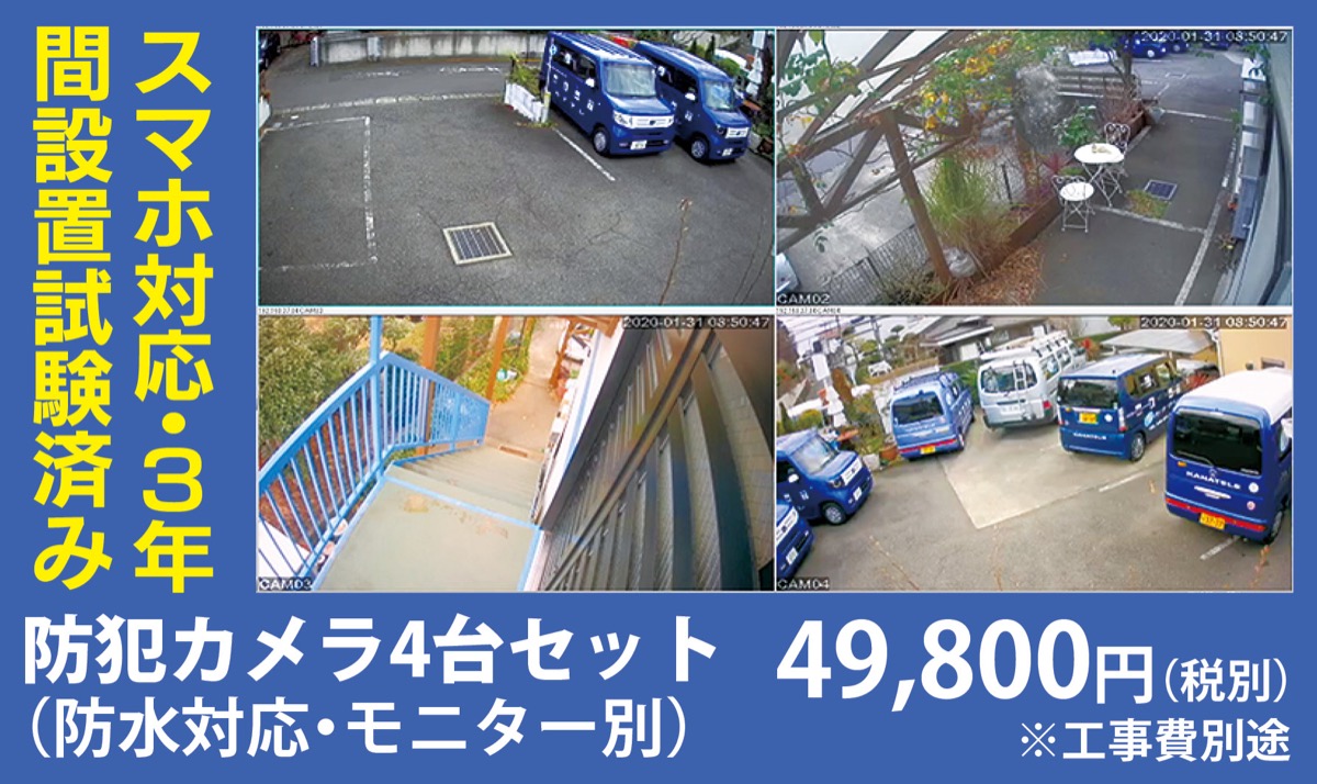 海老名市国分南の通信会社カナテレでは、3年間、自社に設置して機能を確認したスマホ対応の防犯カメラ4台セットを4万9800円(税別・レコーダー・3TB HD・専用ケーブル30m付)で販売している。