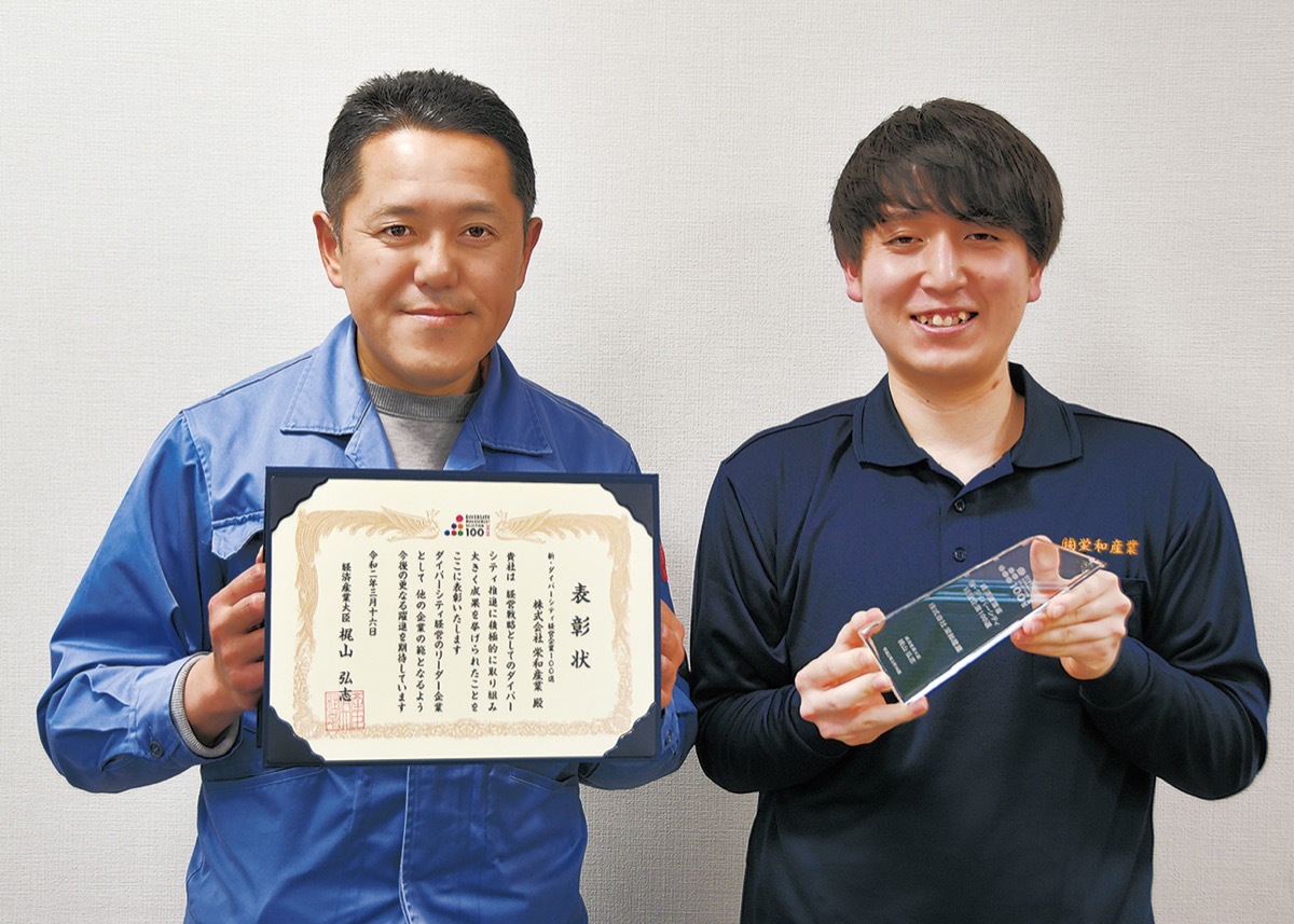 19年度は105社の応募から、栄和産業のほか味の素やコカ・コーラボトラーズジャパン、オリックス、アクサ損害保険など大手7社と中小企業10社が受賞した。過去7年間の県内受賞企業は日産自動車など5社で栄和産業の受賞は県内で6社目となった。