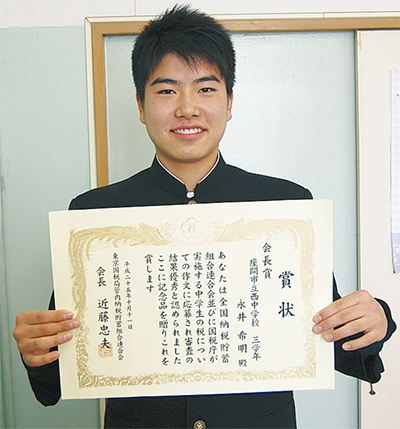 国税庁と全国納税貯蓄組合連合会が主催し、58万編の応募があったコンクール「2013年度 中学生の『税についての作文』」で、西中学校3年の永井希明(のぞみ)さんの「税の価値」が、座間市では最上位となる東京国税局管内納税貯蓄組合連合会の会長賞を受賞した。