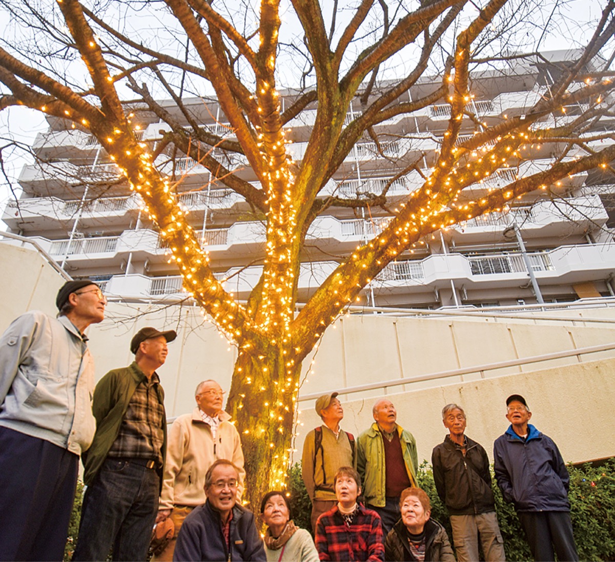 鳶尾団地のユーコープ前の広場で11月15日からイルミネーションの点灯が始まった。地元のコミュニティカフェ荻野のメンバーが準備したもので、LED電球150個ほどが明滅している。