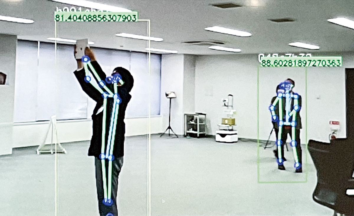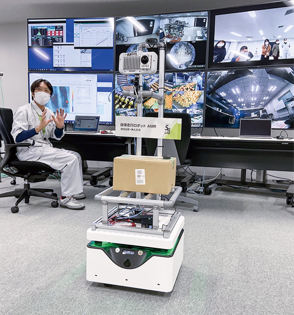 遠隔監視システムの紹介では生産ラインの画面がずらり。先進技術の中でも印象的なのが、働く人の異変をいち早く察知する技術だ。画面に映る人の姿勢の情報や赤外線カメラなどの情報をもとに、転倒などをAIで検知してアラームを出す。カメラの視野に記者が入ると、瞬時に姿勢が線で表示された。工場や農地などでの運用を想定した無人移動ロボットもあった。「自動運転を開始します」という音声とともに、障害物を避けながら決められた場所まで移動する。カメラ画像は遠くで専門家が分析したり、ロボット自体も物を運んだりすることができる。いずれも高速大容量の5Gがあってこその技だ。