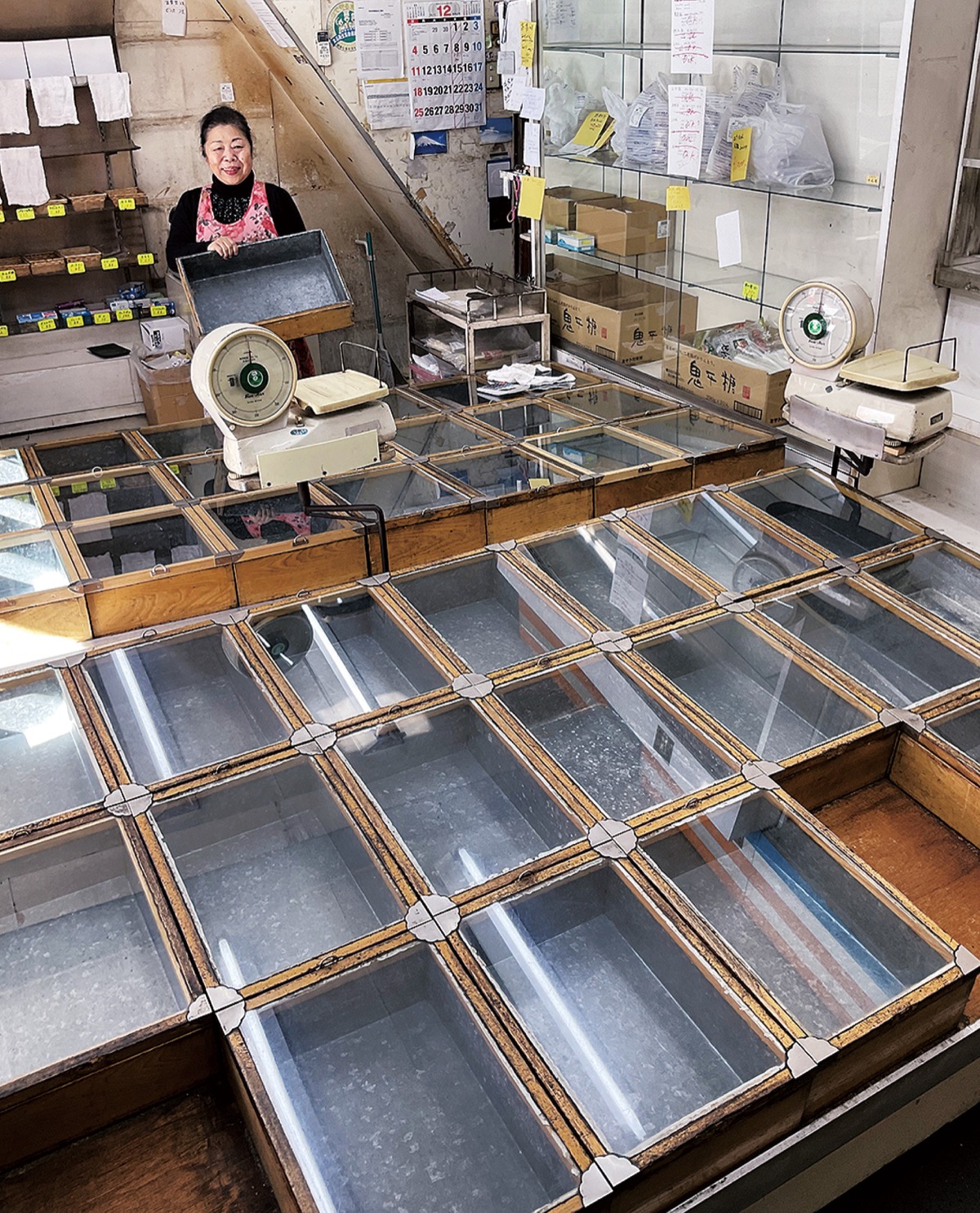 量り売りの菓子を入れる箱は店では番重(ばんじゅう)と呼ぶ。ガラスの蓋つきで内部はブリキ。20年以上前、真夜中に車が店内に突入する事故があり、壊されてしまった事も。箱作りの職人を見つけ、何とか新調し再開した。