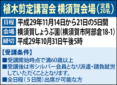 神奈川県シルバー人材センター連合会では、厚生労働省委託事業の「植木剪定講習会」を横須賀市で開催する。