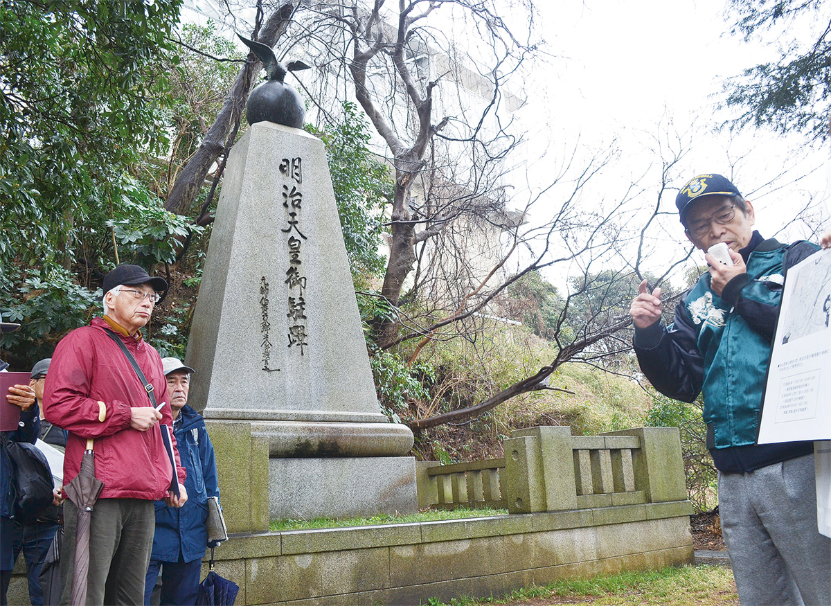 一段下がった所にある小さな公園の中には、行幸の際に宿泊・休憩した向山行在所(海軍兵学校教師館)の建物の跡地を示す「明治天皇横須賀行在所址」の碑もあり、長浜氏は、「碑の建造は当時、名所・史跡を残す運動を横須賀市が展開した」と説明した。