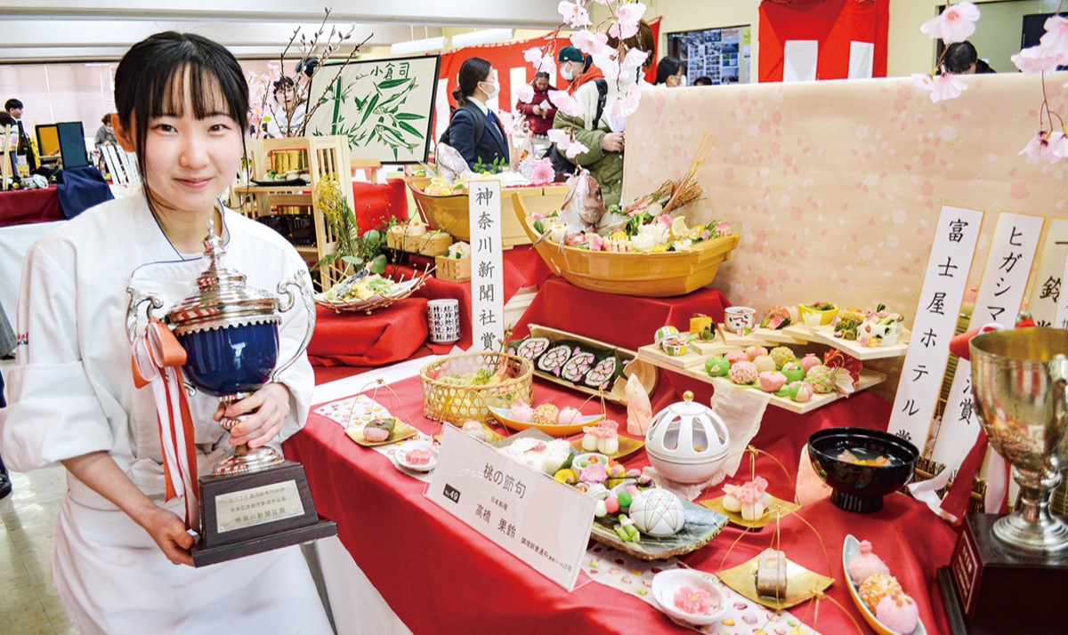 生徒によるオリジナル作品も一堂に並べられ、日本料理、西洋料理、中国料理、製菓の各部門から約60品がエントリーされた。「学長賞」に輝いたのは、高橋果鈴さん(普通科高校コース3年)の日本料理「桃の節句」=写真。春の桜や梅を表す桃色だけでなく、若葉をイメージさせる緑色もあしらうことで色の調和を図ったという。卒業後は和食料理人の道へと進むことから、「食べる前に目でも楽しめる料理を提供したい」と抱負を語った。