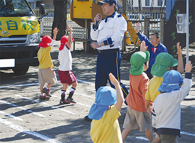 その後、園児らは4人1列になり、横断歩道を渡る練習を行った。広田園長は「命に関わることなので、これから小学校にあがる園児たちに、交通ルールをしっかりと学んでほしい」と開催の意義を話した。