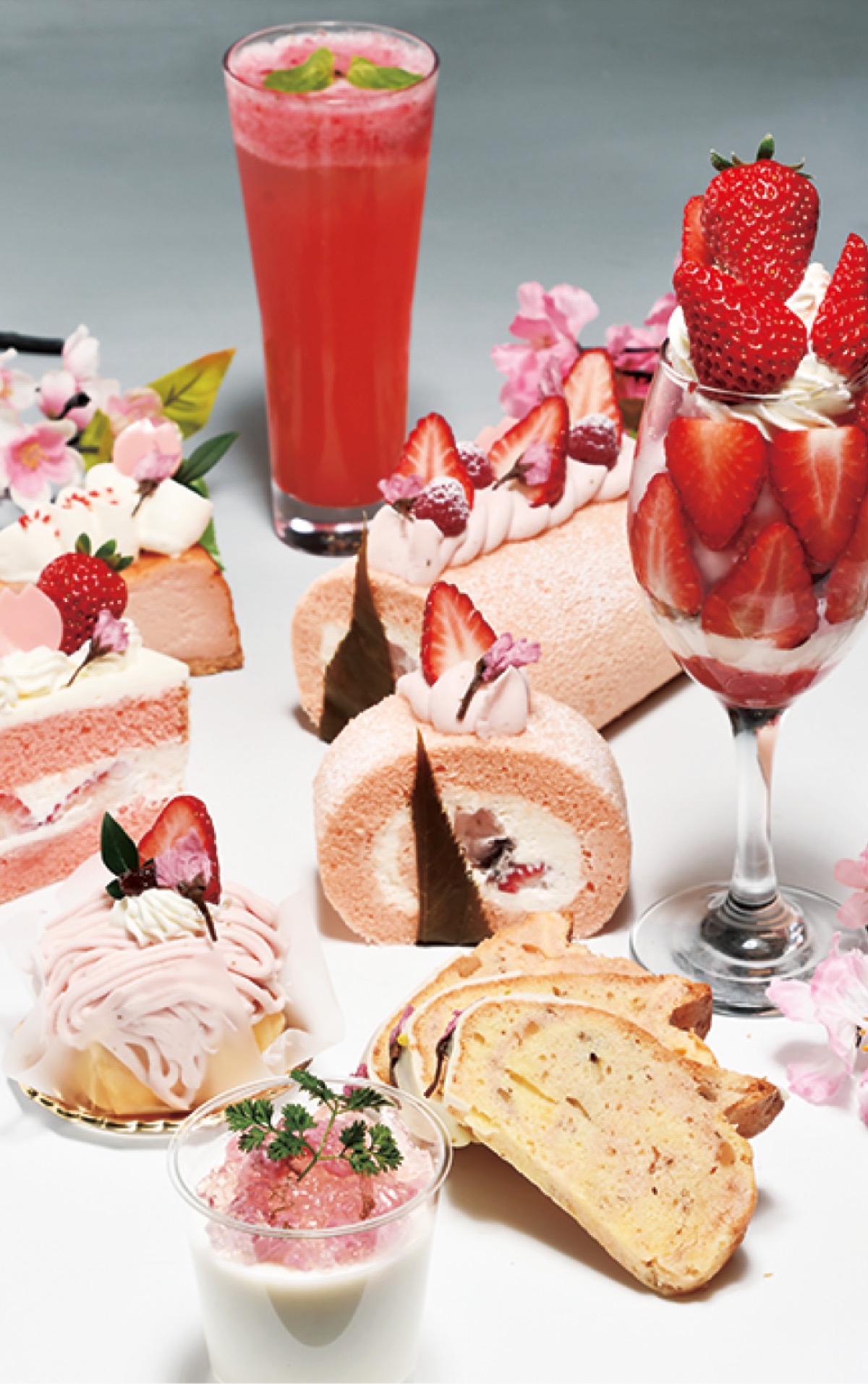 ほんのり桜の香りがするスポンジと国産苺の「桜ショートケーキ」(440円)や、米粉を使用した桜風味の生地に北海道産生クリーム、桜餡、苺、あんこを巻いた「桜ロールケーキ」(ホール1400円/カット440円)、苺、粒あん、求肥の入ったクレープを桜餡で包んだ和スイーツ「SAKURA」(520円)など、期間限定で全9品を楽しむことができる。※価格は全て税別