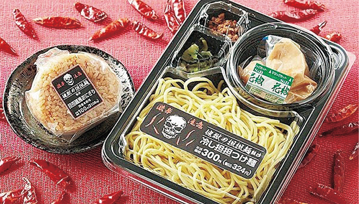 発売したのは「地獄の担担麺監修 冷やし担担つけ麺」(324円)と「地獄の担担麺風おにぎり」(108円)。オリジナルの味を反映し、つけ麺は強烈な辛さとごまの風味を表現。おにぎりは、豆板醤などで味付けした米にピリ辛の肉みそをトッピングした。