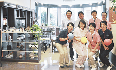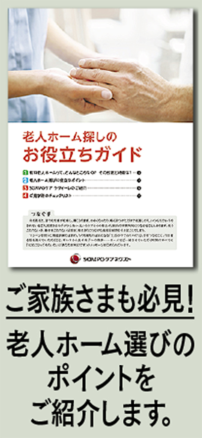 「筋力低下を予防し、硬くなった関節を改善していくためには、朝起きて夜眠るまでの15時間の中に、効率よく運動を取り入れることが大事です」と話すのは、理学療法士の島内美香さん。スタッフ同士が連携をとり、普段の生活の中でこまめにサポートしている。 ホームの雰囲気を体験できる「お食事体験&見学会」を随時開催しているので、ぜひ訪れてみては。電話で問い合わせをすると「老人ホーム探しのお役立ちガイド」をプレゼント。資料請求、介護に関する相談などは下記へ。
