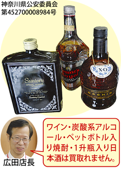 「封を切っていなくても、買取り時は中古値段になることをご了承ください。以前タウンニュースで紹介したハイヒール型のウイスキーが、掲載から4日で売れました!変わった容器に入ったお酒や、バカラグラスなどの空き瓶も買取りますので、ぜひご来店ください」と広田店長。